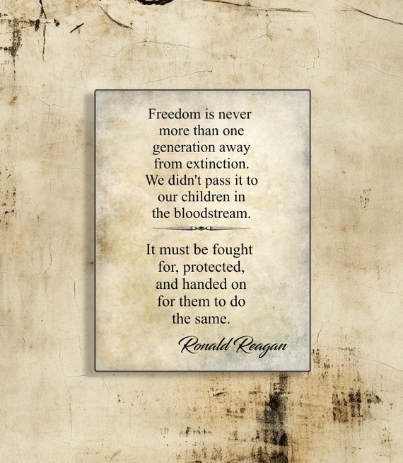 Reagan Quote Freedom Is Never More – “Freedom is never more than one generation away from extinction,” Reagan reminded us. “We didn’t pass it to our children in the bloodstream. It must be fought for, protected, and handed on . In 1989, after two terms in office, Ronald Reagan more rules and regulations and confiscatory taxes, the government was taking more of our money, more of our options, and more of our freedom. .